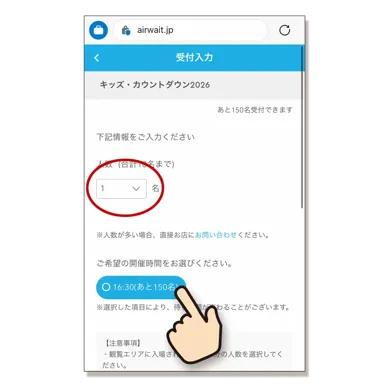 予約画面から、 ”観覧エリアに入場される方の人数” と ”ご希望の時間帯” を入力します。