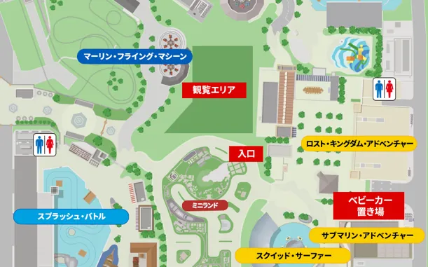 ※より多くの方にショーをご覧いただくため、ベビーカーは観覧エリア内へお持ち込みいただけません。ベビーカー置き場(図参照)をご利用ください。